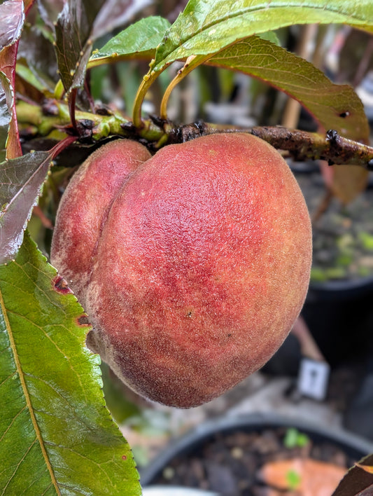 „Zwergpfirsich Crimson Bonfire – kompakter Zwergpfirsich | Roter Blattschmuck | Süße Früchte | Winterhart im Topf & Garten“